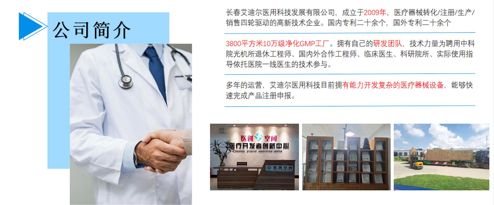 長春艾迪爾醫(yī)用科技發(fā)展有限公司為集產(chǎn)(自有工廠); 學(xué)(多所院校科研課題合作單位);研(研發(fā)成果轉(zhuǎn)化注冊)三位一體的高新技術(shù)企業(yè)。艾迪爾科技主要經(jīng)營范圍為一次性醫(yī)療器械耗材的開發(fā),專注于抗菌肽新材料的開發(fā)和研制,以“IN-58抗菌肽一類新藥及原料藥注冊、激光類治療儀”兩個核心優(yōu)勢技術(shù)為中心。公司擁有標準GMP車間及健全的質(zhì)量管理體系,擁有多個已上市和即將上市的產(chǎn)品,包括睡眠、泌尿、口腔、肝膽、消殺、婦科六大系列產(chǎn)品線。公司擁有核心專業(yè)技術(shù)報批團隊,承接國內(nèi)外醫(yī)療器械專項成果轉(zhuǎn)化,具備自主研發(fā)能力及MAH服務(wù)能力。